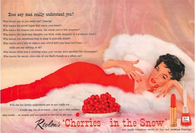 1953 magazine ad for "Cherries in the Snow" lipstick and nail polish.